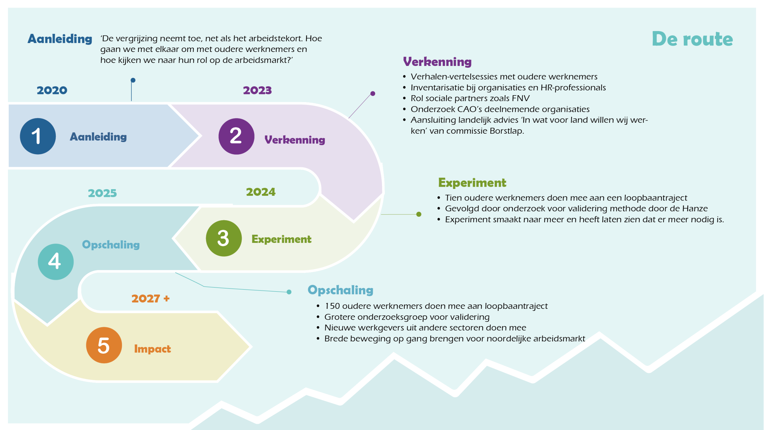 Voorafgaand aan het experiment zijn vertelsessies georganiseerd met oudere werknemers, HR-professionals en loopbaanadviseurs. Hieruit bleek dat er weinig beleid is gericht op 55-plussers, ondanks hun behoefte aan invloed op het werk, begeleiding bij fysieke klachten en voorbereiding op het leven na pensioen. De sessies gaven inzicht in obstakels en kansen. HR-professionals zagen het belang van een experimentele aanpak buiten de eigen organisatie: een veilige plek waar ouderen vrij kunnen nadenken over hun toekomst. In klankbordsessies werd dit idee verder uitgewerkt. Met steun van sociale partners zoals het FNV ontstond een breed gedragen plan: een praktijkgericht experiment waarin oudere medewerkers hun loopbaan en betekenisvolle bijdrage opnieuw konden vormgeven.